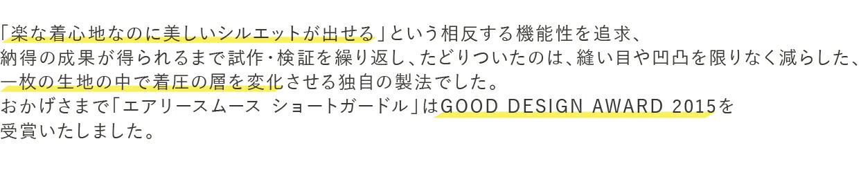 暑い夏にサラッと着けられるガードルを探していたところ、こちらを発見!見た目も気に入ったので購入したところ、機能的にも大満足!腿への食い込みもなく着け心地も良い。