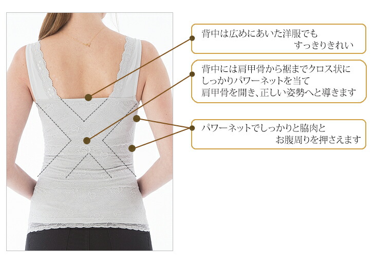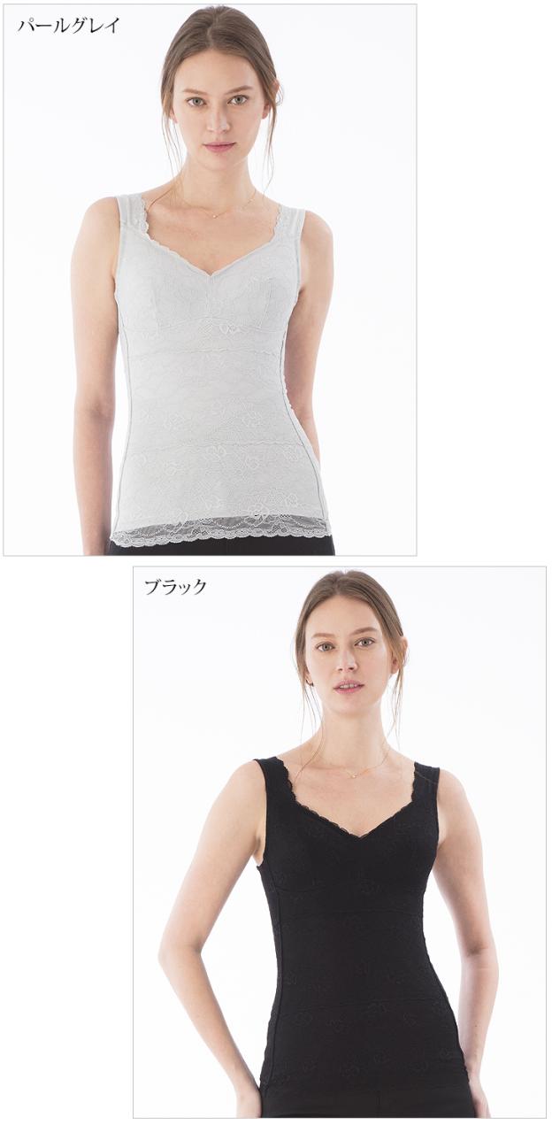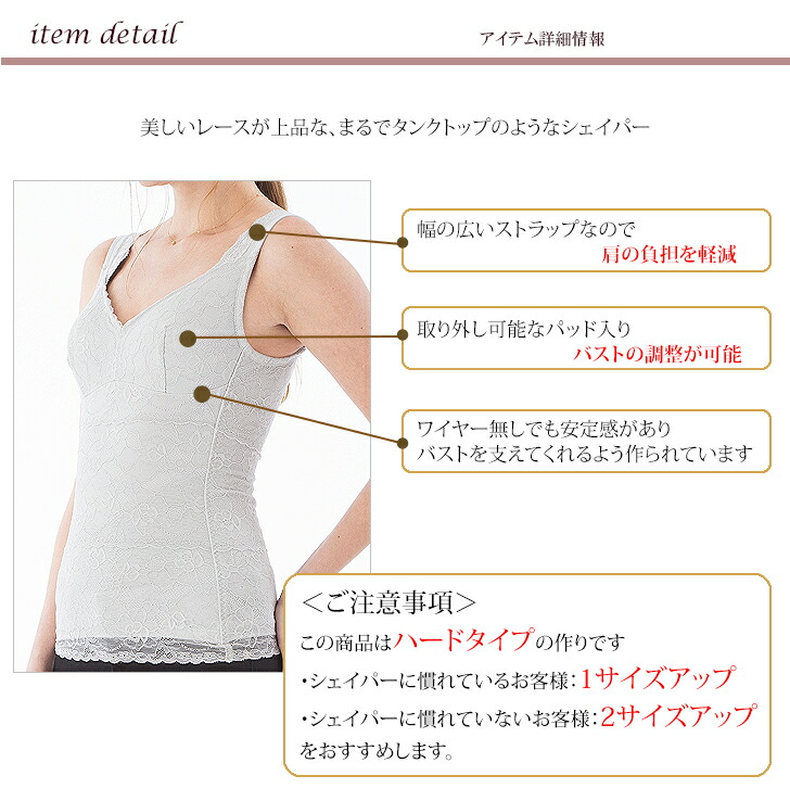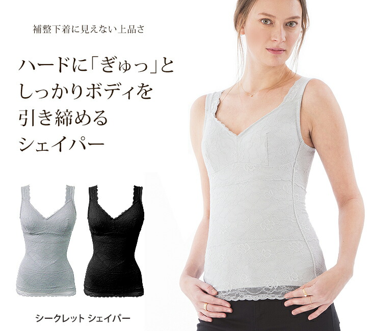 引き締めを重要視する…Moreボディシェイパーは引き締まりますが、多くは下着の生地を使っているのでその上にキャミソールを着用していました。こちらはレース生地も重ねてあり、そのまま洋服を着ることも出来ますし、ちらっと見えても大丈夫です。