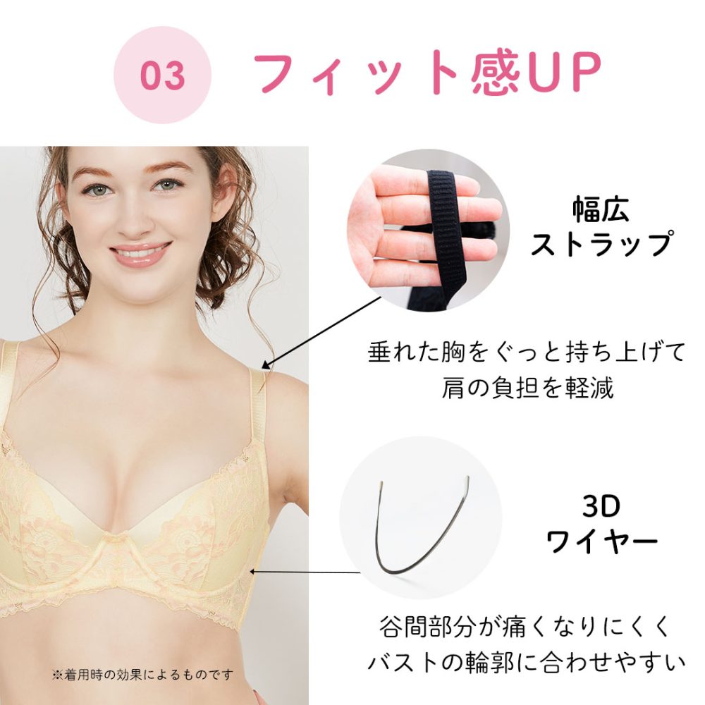このブラは他のものとホールド感、安心感が違い愛用してます。しっかり胸を支えて寄せてくれて、付けたときの形もとても綺麗で満足です。