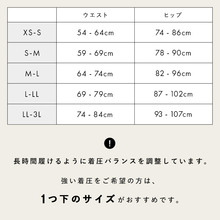 | カラー | XS – S(ウエスト54-64cm), S – M(ウエスト59-69cm), M – L(ウエスト64-74cm), L – LL(ウエスト69-79cm), LL – 3L(ウエスト74-84cm) |